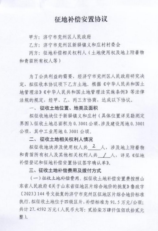 新驿镇义和庄村征地补偿安置协议
