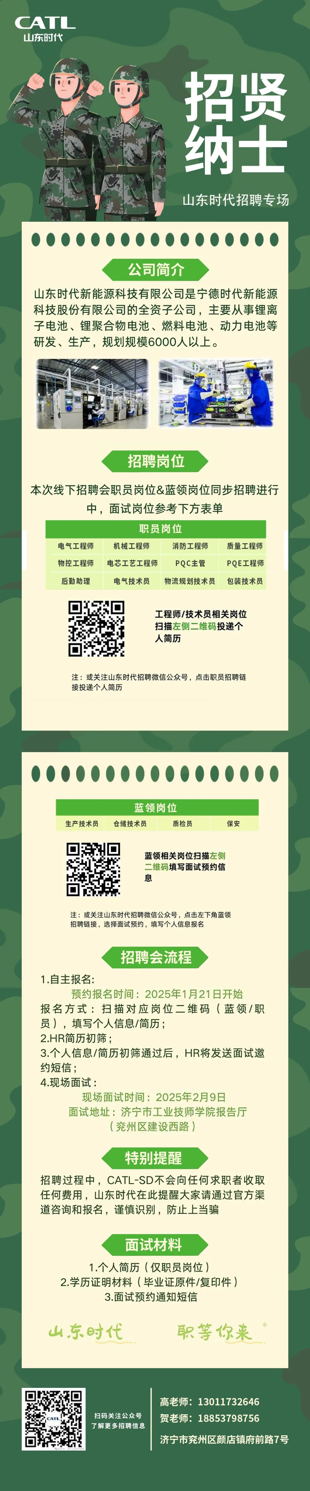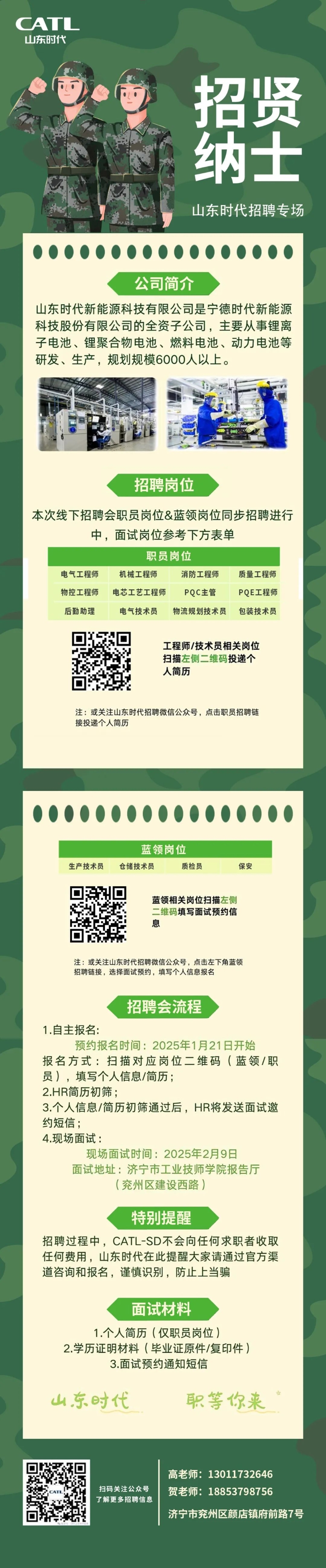 公司简介:山东时代新能源科技有限公司是宁德时代新能源科技股份有限公司的全资子公司,主要从事锂离子电池、锂聚合物电池、燃料电池、动力电池等研发、生产,规划规模6000人以上。