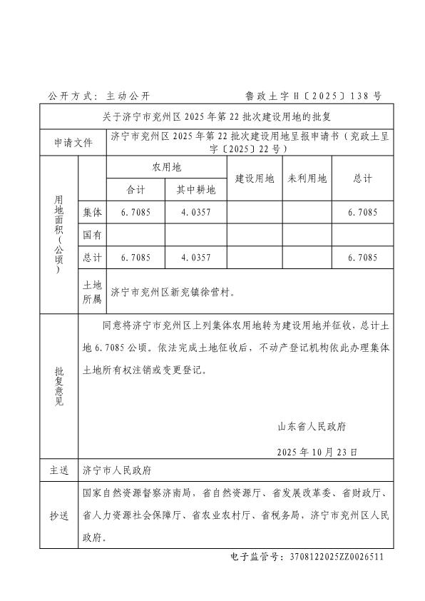 关于济宁市兖州区2025年第22批次建设用地的批复