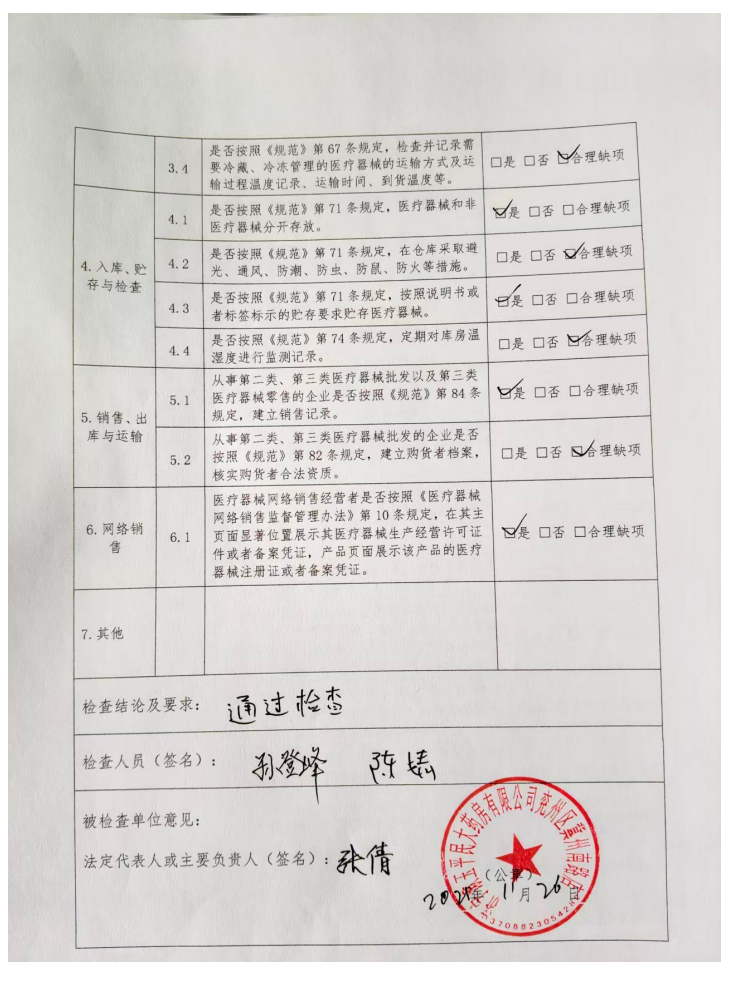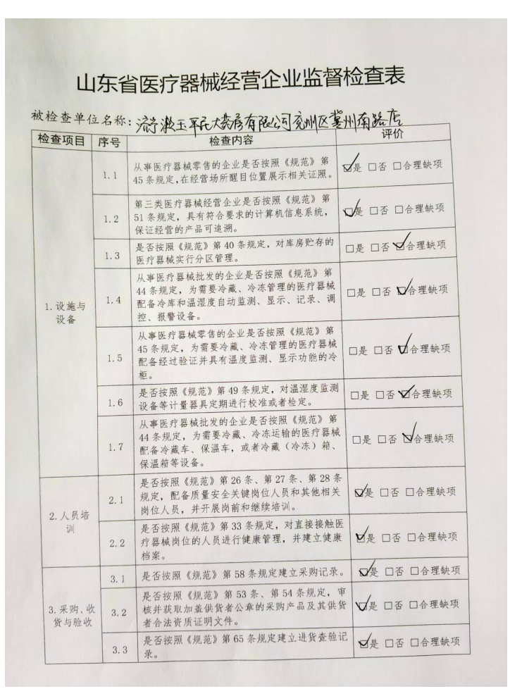 【医疗器械经营监督检查结果】济宁漱玉平民大药房有限公司兖州区冀州南路店检查记录表