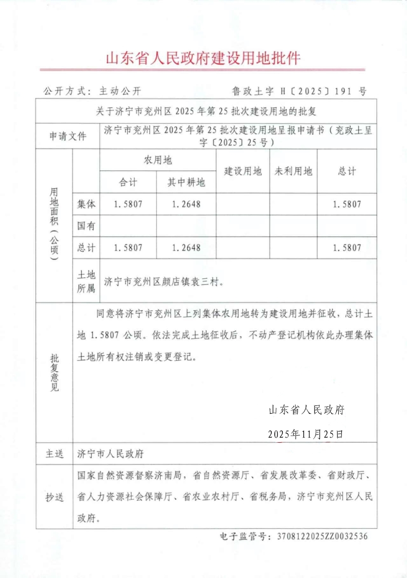 关于济宁市兖州区2025年第25批次建设用地的批复
