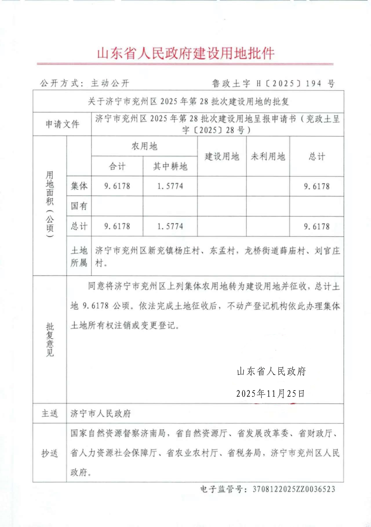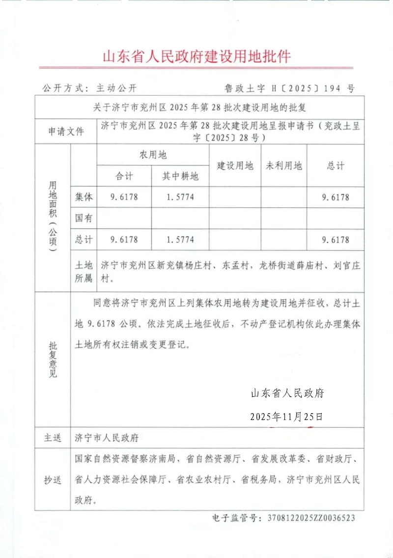 关于济宁市兖州区2025年第28批次建设用地的批复