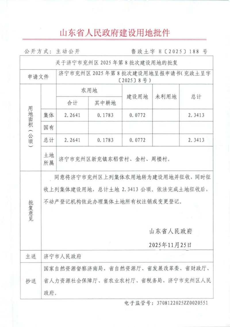 关于济宁市兖州区2025年第8批次建设用地的批复
