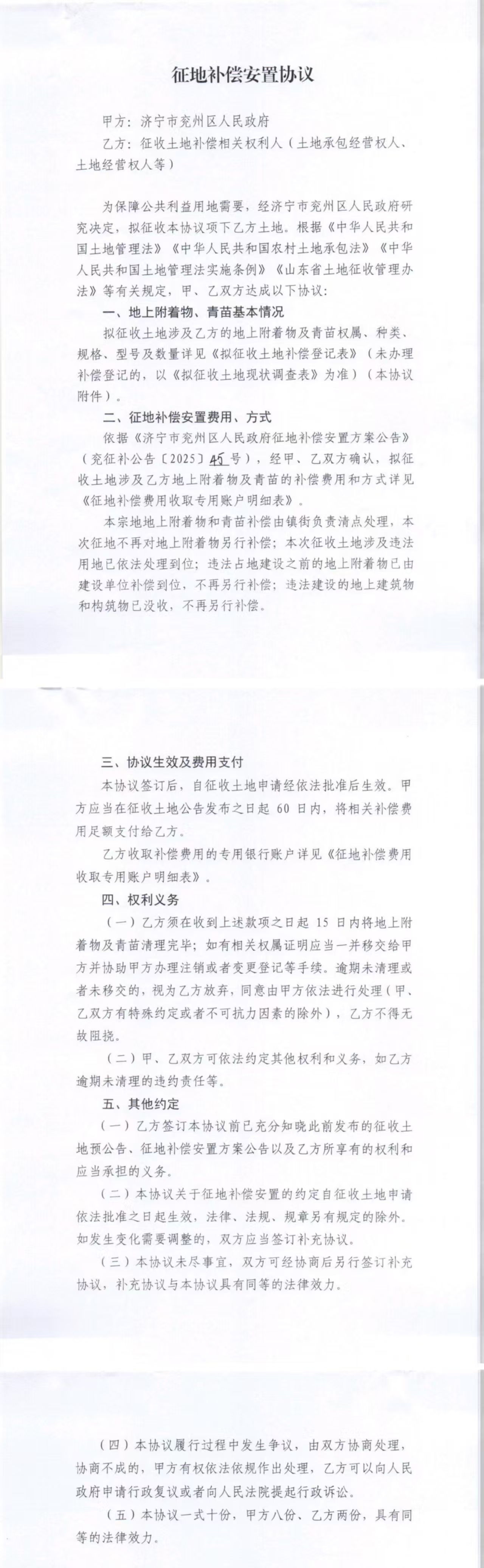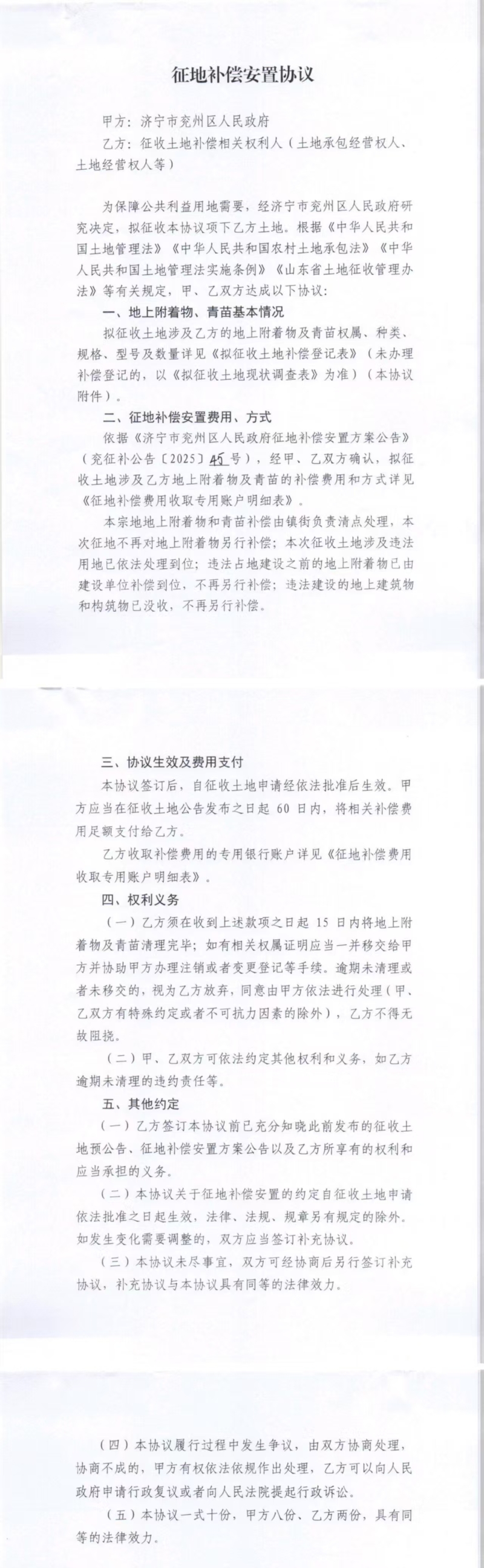 征地补偿安置协议(承包经营权人)龙桥街道任老庄村