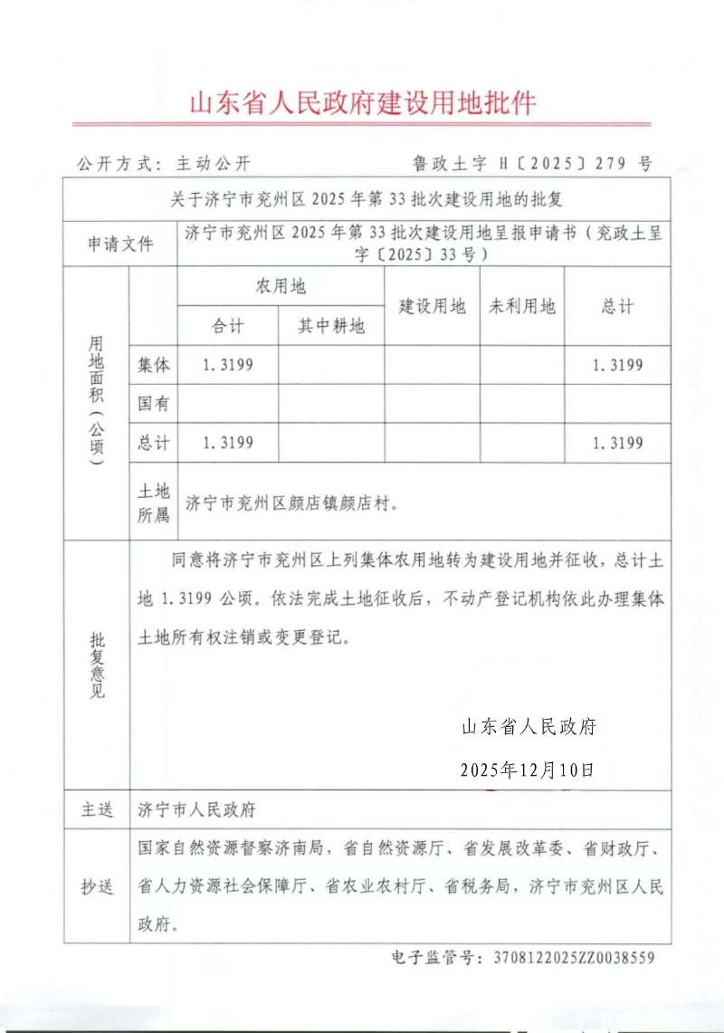 关于济宁市兖州区2025年第33批次建设用地的批复