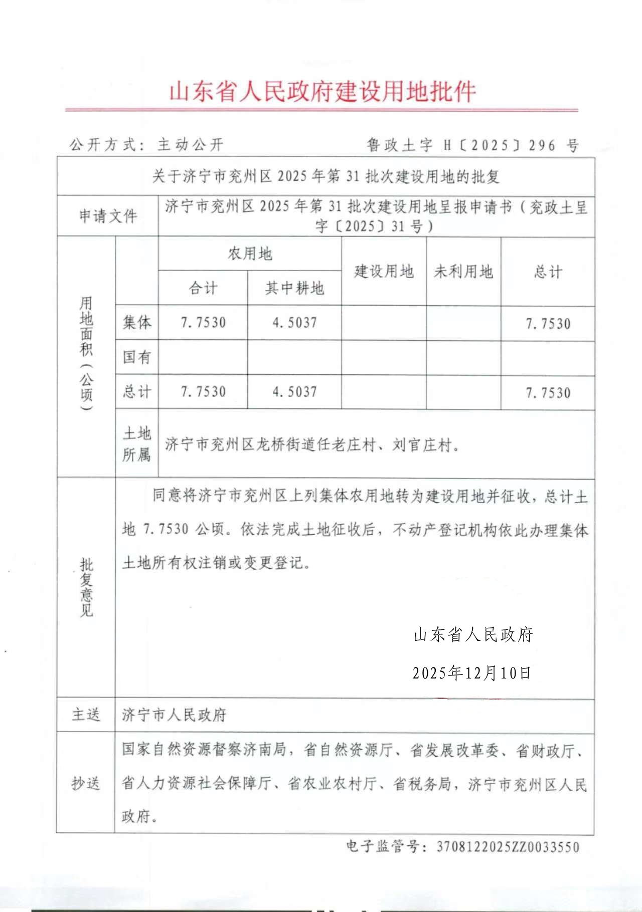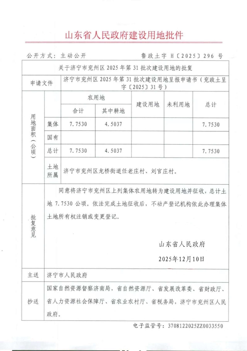 关于济宁市兖州区2025年第31批次建设用地的批复