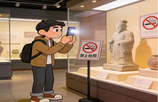 在博物馆内使用闪光灯拍摄禁止摄影的展品,可能损害文物安全。