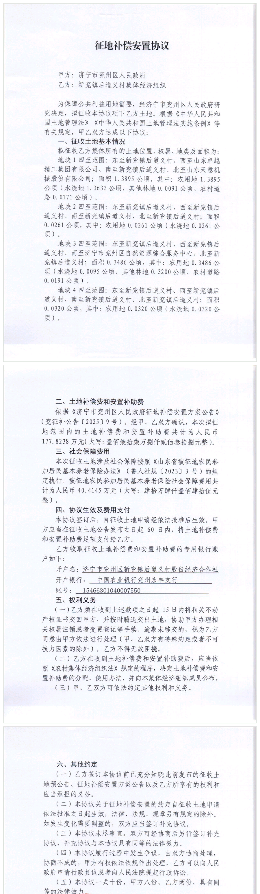 征地补偿安置协议(所有权人) 新兖镇后道义村