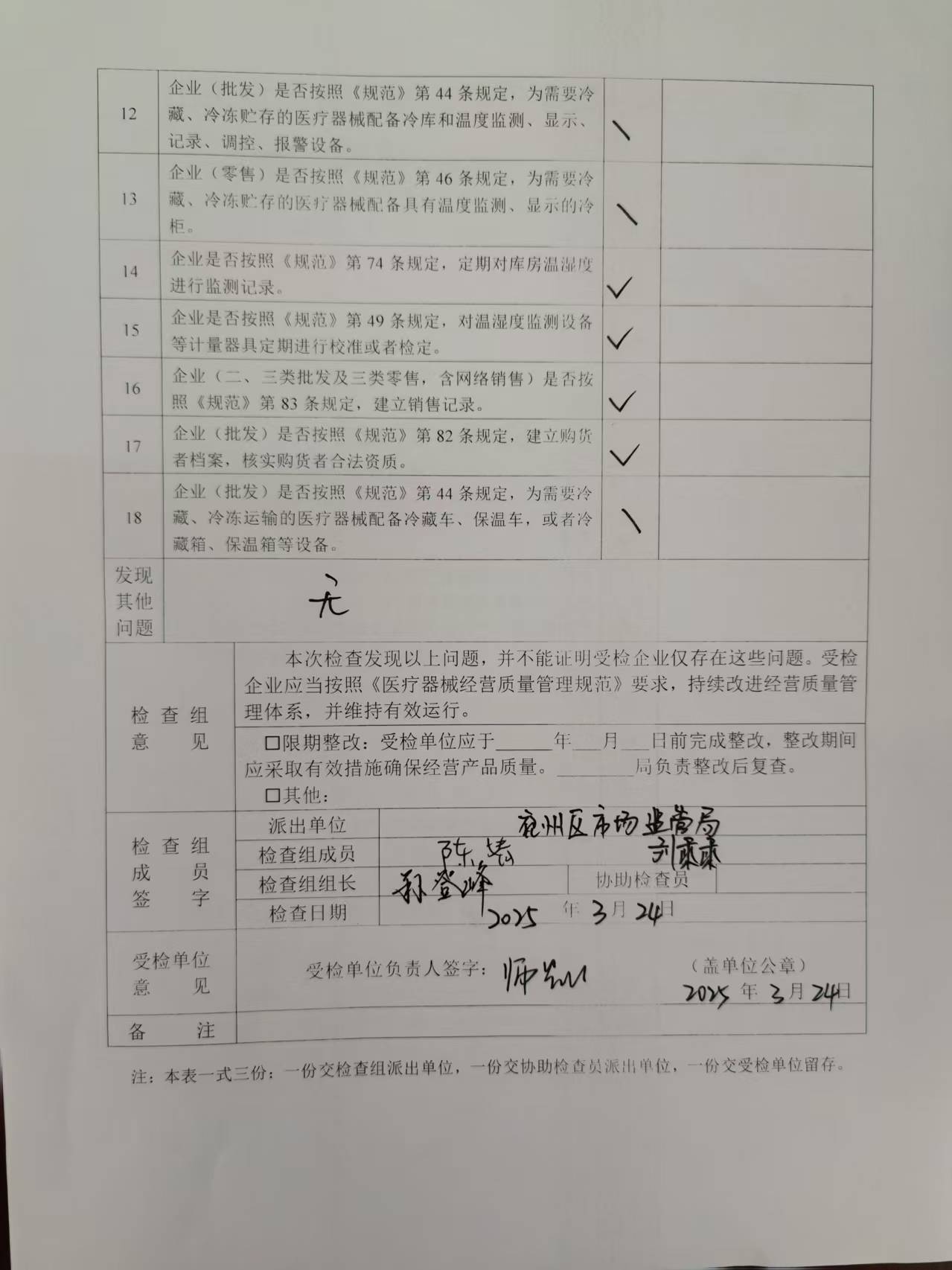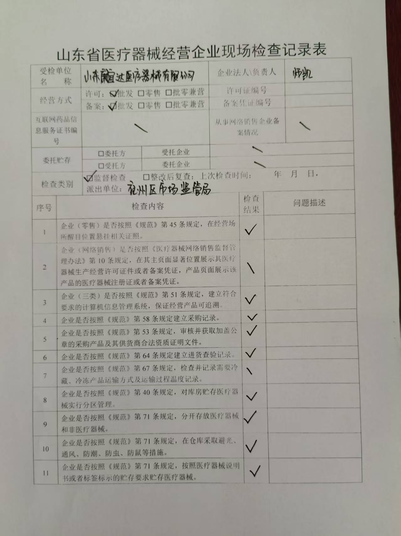【医疗器械经营监督检查结果】山东康宜达医疗器械有限公司检查记录表