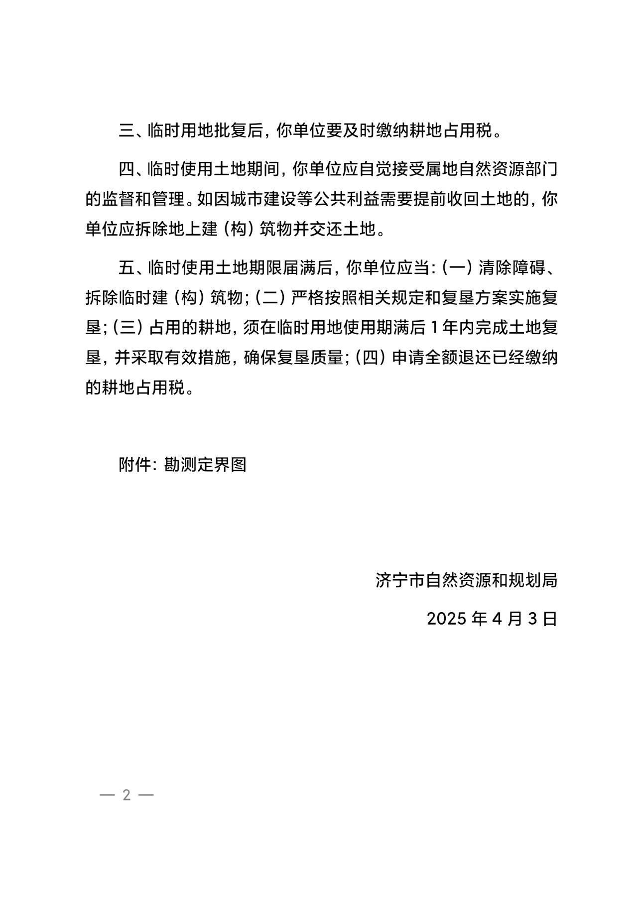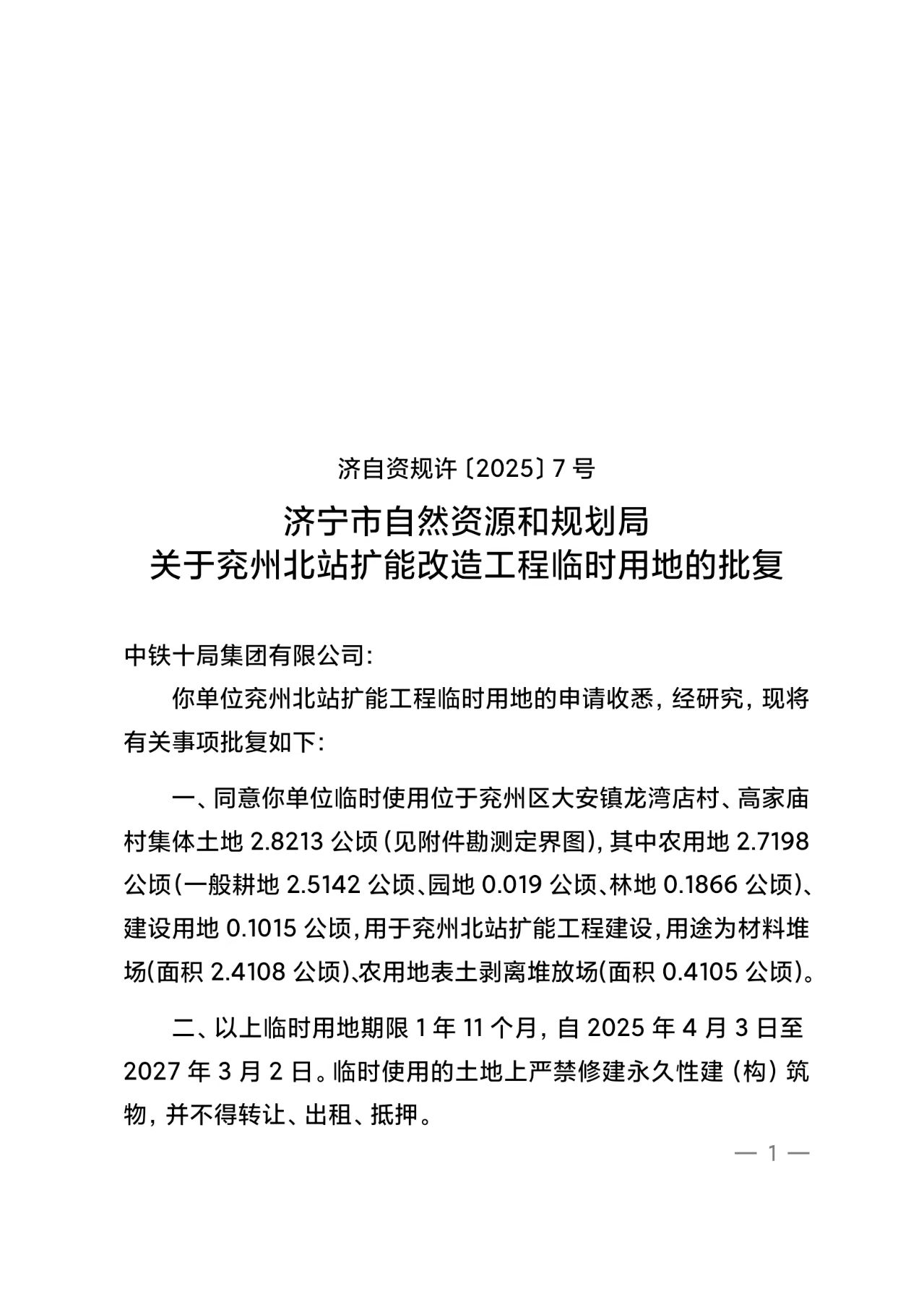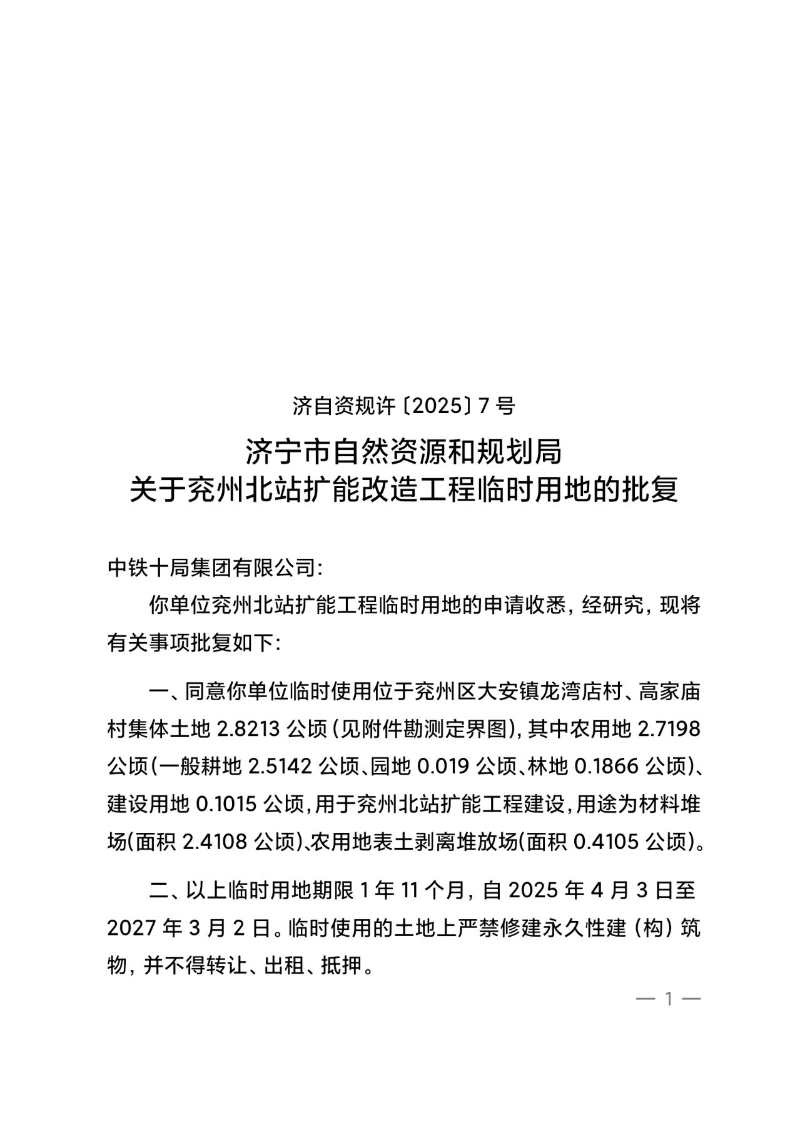 济宁市自然资源和规划局关于兖州北站扩能改造工程临时用地的批复(济自资规许〔2025〕7号)