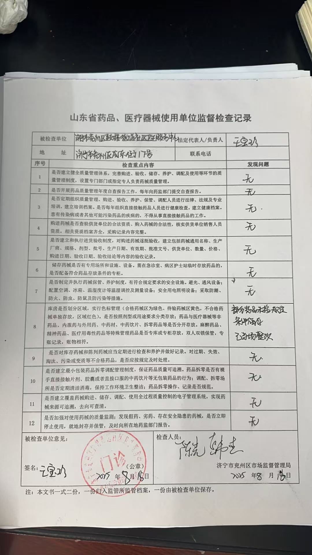 【医疗机构使用药品质量安全监督检查结果】鼓楼街道社区卫生服务中心检查记录表