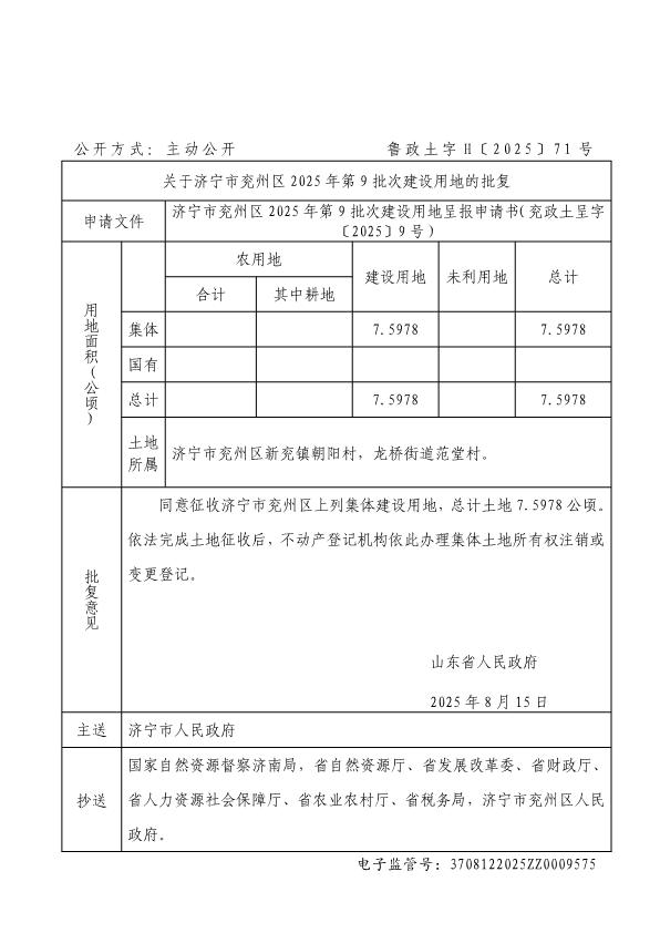 关于济宁市兖州区2025年第9批次建设用地的批复