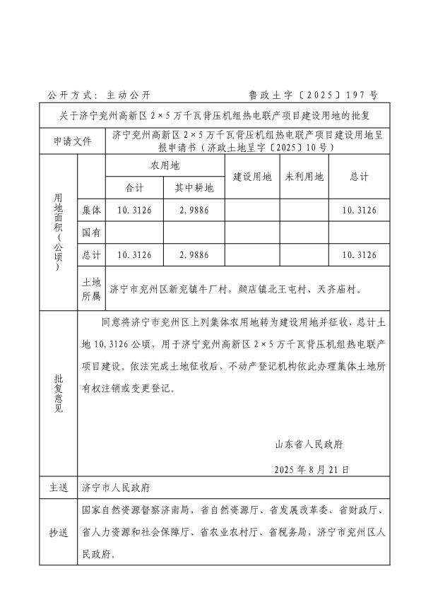 济宁兖州高新区2×5万千瓦背压机组热电联产项目建设用地批复