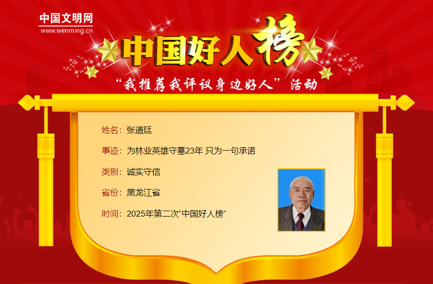 为了一句承诺,23年守护“老哥哥”从小生活在林区,又有幸与马永顺成为工友,张道廷亲历和见证了林业英雄马永顺一生为国、无私奉献的决心与壮举。当年马永顺感慨:“人总有一死,树比人长久。”张道廷说:“老哥,你不用惦记啥,真有那么一天,我会年年去看你。”就为这句承诺,张道廷为林业英雄马永顺守墓23年。2002年12月,张道廷从领导岗位退居二线,回到阔别16年的马永顺林场,追寻林业英雄的足迹,开始了为英雄义务守墓的漫长岁月。整整23年,他怀着对英雄的无限敬仰,春天除尘,夏日薅草,秋扫落叶,冬季清雪,一年四季,雷打不动。2012年冬天下了50多场雪,遇上大雪时,他就和妻子一起去墓地清雪,内衣被汗水湿透都是常事。2020年,张道廷因冠心病住进了医院,出院后第一件事就是去墓地看望老英雄。在妻子的陪同下,他把英雄墓地清扫得干干净净。张道廷用行动践行了“给你守墓一辈子”的诺言、感动着林区千千万万的人。
