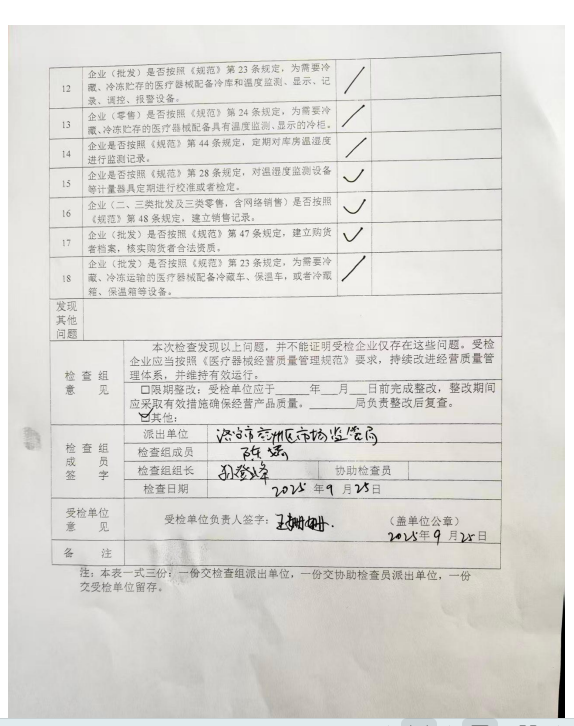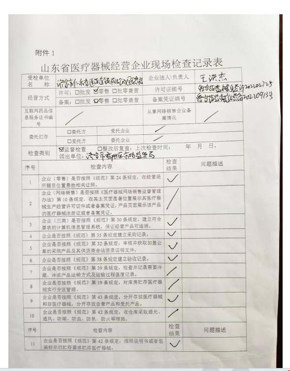 【医疗器械经营监督检查结果】济宁市仁和堂医药连锁有限公司民瑞店检查记录表