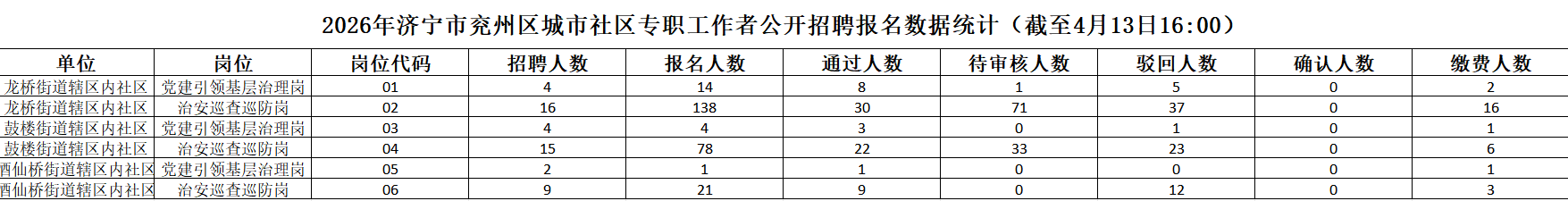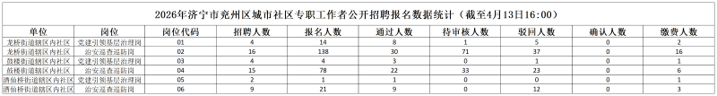 2026年济宁市兖州区城市社区专职工作者公开招聘报名数据统计(截至4月13日16:00)
