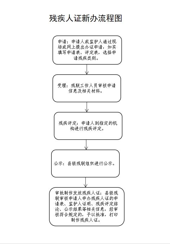 | 审批制作发放残疾人证 | 县级残联审核申请人申办残疾人证的申请表、监护人证明、残疾评定结论、公示结果等相关信息,经审核符合规定的,予以批准,打印制作残疾人证。 | 根据各县(市、区)残联实际情况确定办理时限。 | 县级残联打印制作残疾人证后,通过原受理渠道或者邮递等便捷方式,将残疾人证发放至申请人。 |