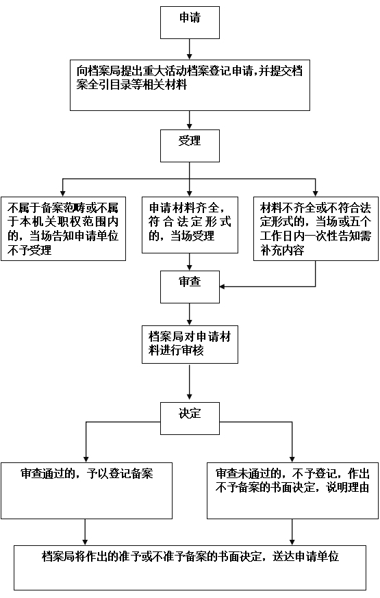 | 办结 | 档案局将作出的准予或不准予备案的书面决定,送达申请单位 | 办结0.5日 | 符合要求予以办理,不符合的说明理由 |