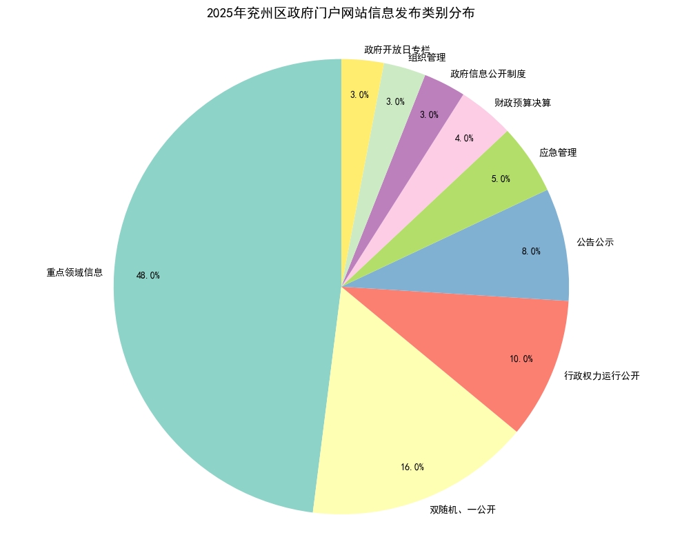2025年通过兖州区政府门户网站共发布信息100条,其中财政预算决算4条,应急管理5条,公告公示8条,行政权力运行公开10条,重点领域信息48条,政府信息公开制度3条,组织管理3条,“政府开放日”专栏3条,“双随机、一公开”专栏16条。