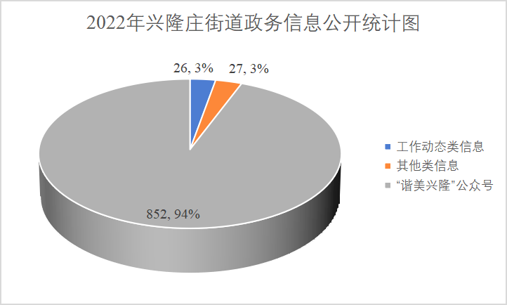 截止2022年12月31日,兴隆庄街道主动公开信息905条,其中通过兖州政府网上公开政府信息53条,包括工作动态类信息26条,其他类信息27条;通过“谐美兴隆”微信公众号发布信息852条。