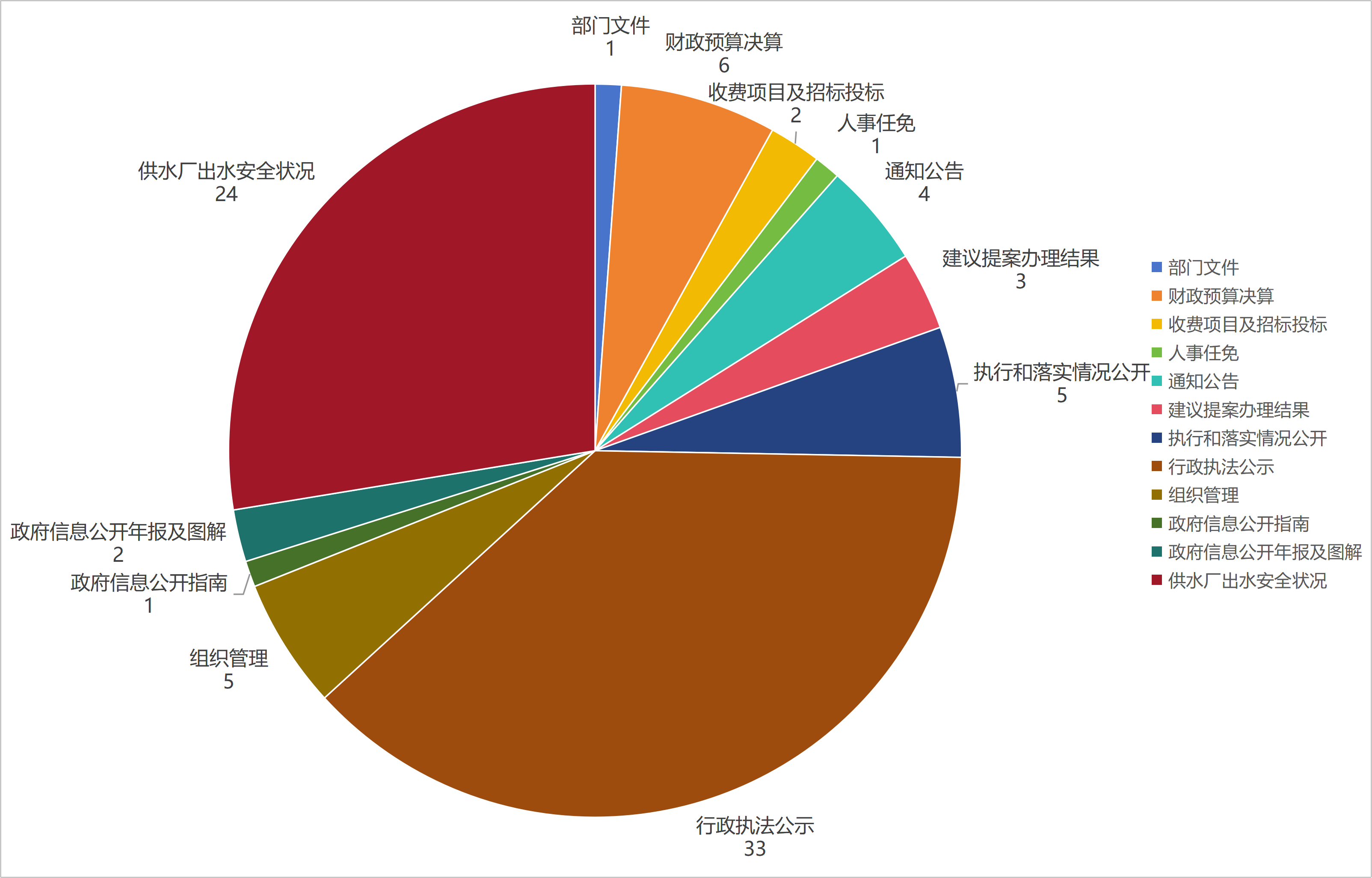 本年度区水务局主动公开政府信息87条,其中:部门文件1条,财政预算决算6条,收费项目及招标投标2条,人事任免1条,通知公告4条,建议提案办理结果3条,执行和落实情况公开5条,行政执法公示33条,组织管理5条,政府信息公开指南1条,政府信息公开年报及图解2条,供水厂出水安全状况24条。