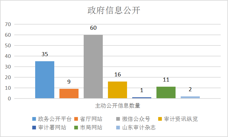 2021年,我局紧紧围绕区委、区政府中心开展工作,认真贯彻实施《中华人民共和国政府信息公开条例》,层层分解落实区委区政府2021年工作安排,平稳、有序地推进政府信息公开工作,在服务经济社会发展、转变政府职能、保证行政权力公开透明运行和保障公民知情权和参与权等方面发挥了积极作用。2021年,一方面,通过兖州区政府网上信息公开专栏及时公开政府信息共35条,其中机构职能信息2条、领导信息1条、规划计划信息3条、政策解读8条、部门文件2条、部门财政预算决算3条、行政执法信息2条、招考录用信息1条、主动公开基本目录1条,审计结果信息3条、政务公开组织管理5条以及政府工作报告落实信息4条。另一方面,加强政务新媒体建设,统筹推进微信公众号与政府信息公开网站协同联动、融合发展。主动运用新媒体渠道“兖州审计”微信公众号,发挥其传播速度快、覆盖面积广、社会渗透力强的优势,进行多形式、多方面的发布,形成了政府信息公开新态势。2021年,区审计局通过“兖州审计”微信公众号发布信息60篇;通过省级官方媒体“审计资讯纵览”发布信息16篇;“山东省审计厅”网站发布信息12篇;《山东审计杂志》发布信息2篇,“审计署”网站发布信息1篇,通过多渠道展示区审计局审计工作成果,审计机关良好形象在全市、全区范围内得到广泛宣传。