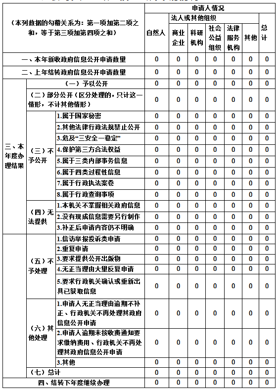 全年未收到政府信息公开申请,未发生政府信息公开举报、投诉情况,也没有政府信息公开行政复议和诉讼情况。