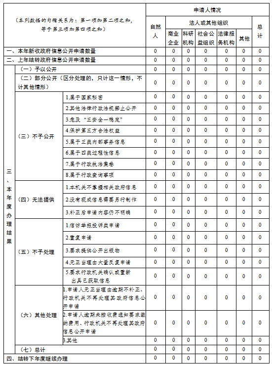 全年收到0条政府信息公开申请,未发生政府信息公开举报情况,也没有政府信息公开行政复议和诉讼情况。