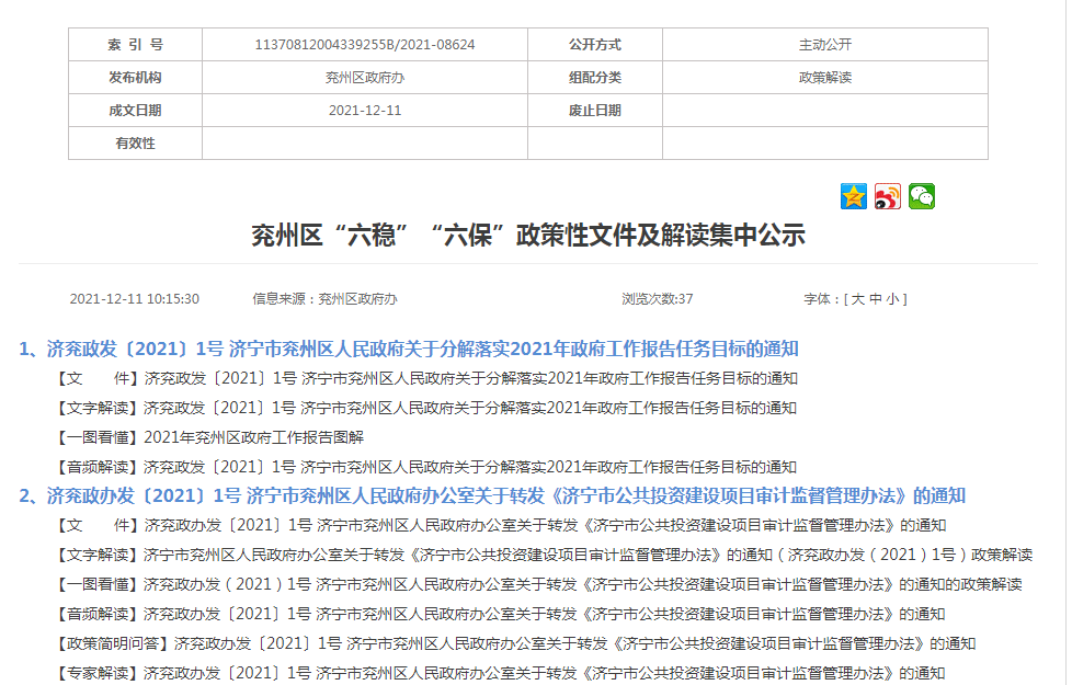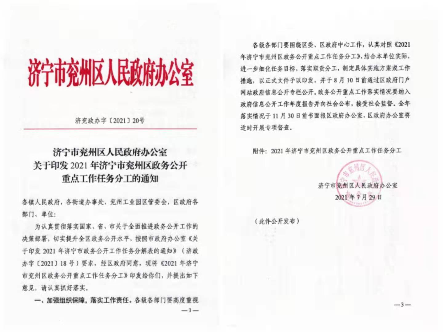 一是扎实做好法定主动公开内容发布。加强制度保障,出台相应政策文件,印发了《济宁市兖州区人民政府办公室关于印发<2021年济宁市兖州区政务公开重点工作任务分工>的通知》(济兖政办字〔2021〕20号),明确重点工作任务分工,保证各项工作稳定有序开展。