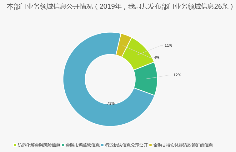 2.本部门业务领域信息公开情况。一是结合重点领域分工任务,我局及时公开防范化解金融风险信息3条,着力宣传防范和打击非法集资;公开金融市场监管信息3条,宣传相关制度规定与政策文件。二是推进行政执法信息公示公开。作为行政执法单位,我局及时对行政执法主体资格、权责清单、行政执法人员、行政执法“三项制度”及其配套制度、行政执法服务指南、2019年度执法结果与统计年报进行了公示。三是做好政策宣传工作,在惠企政策专栏公布金融支持实体经济政策汇编信息1条,提高金融服务实体经济水平,解决企业融资难融资贵问题,支持民营经济高质量发展。