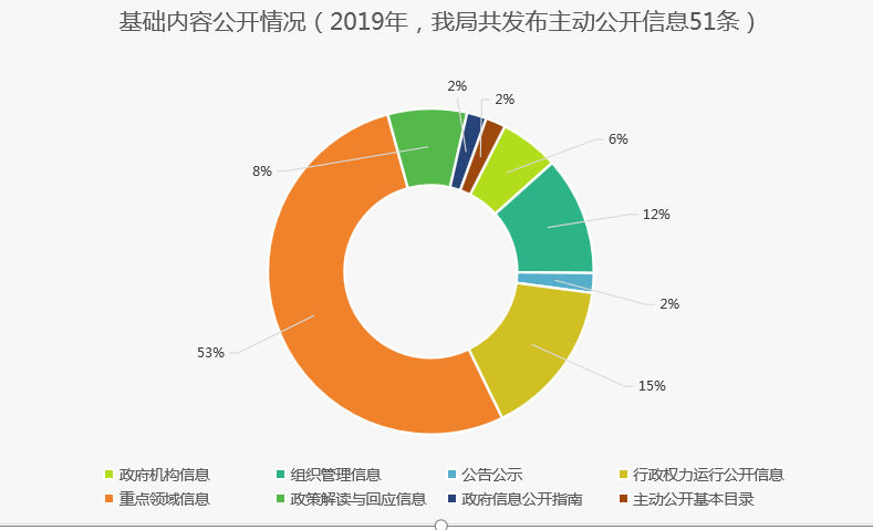 1.基础内容公开情况。2019年,我局共发布主动公开信息51条。内容涉及政府机构、组织管理、公告公示、行政权力运行公开、重点领域、政策解读与回应、政府信息公开指南、主动公开基本目录8部分。其中政府机构信息3条,对区地方金融监管局内设机构、领导信息、主要职责进行了公开;组织领导信息6条,对区地方金融监管局政务公开工作进行了规划与部署,成立区地方金融监管局政务公开领导小组,制定了相关培训计划与实施方案;公告公示1条,内容涉及区地方金融监管局下属地方金融信息服务中心设立登记公告;行政权力运行信息公开8条,主要围绕兖州区十八届人大三次会议和兖州区政协十四届三次会议提案进行答复;重点领域信息27条,其中财政信息预决算公开2条,行政执法信息公示19条,金融市场监管信息公开3条,防范化解重大风险信息公开3条;政策解读与回应公开4条,内容主要涉及转发山东省地方金融监督管理局相关政策文件与政策解读;政府信息公开指南1条,主要对我局政府信息公开范围、公开机构设置、依申请公开渠道、不予公开内容、监督与救济方式进行公开;主动公开基本目录1条。