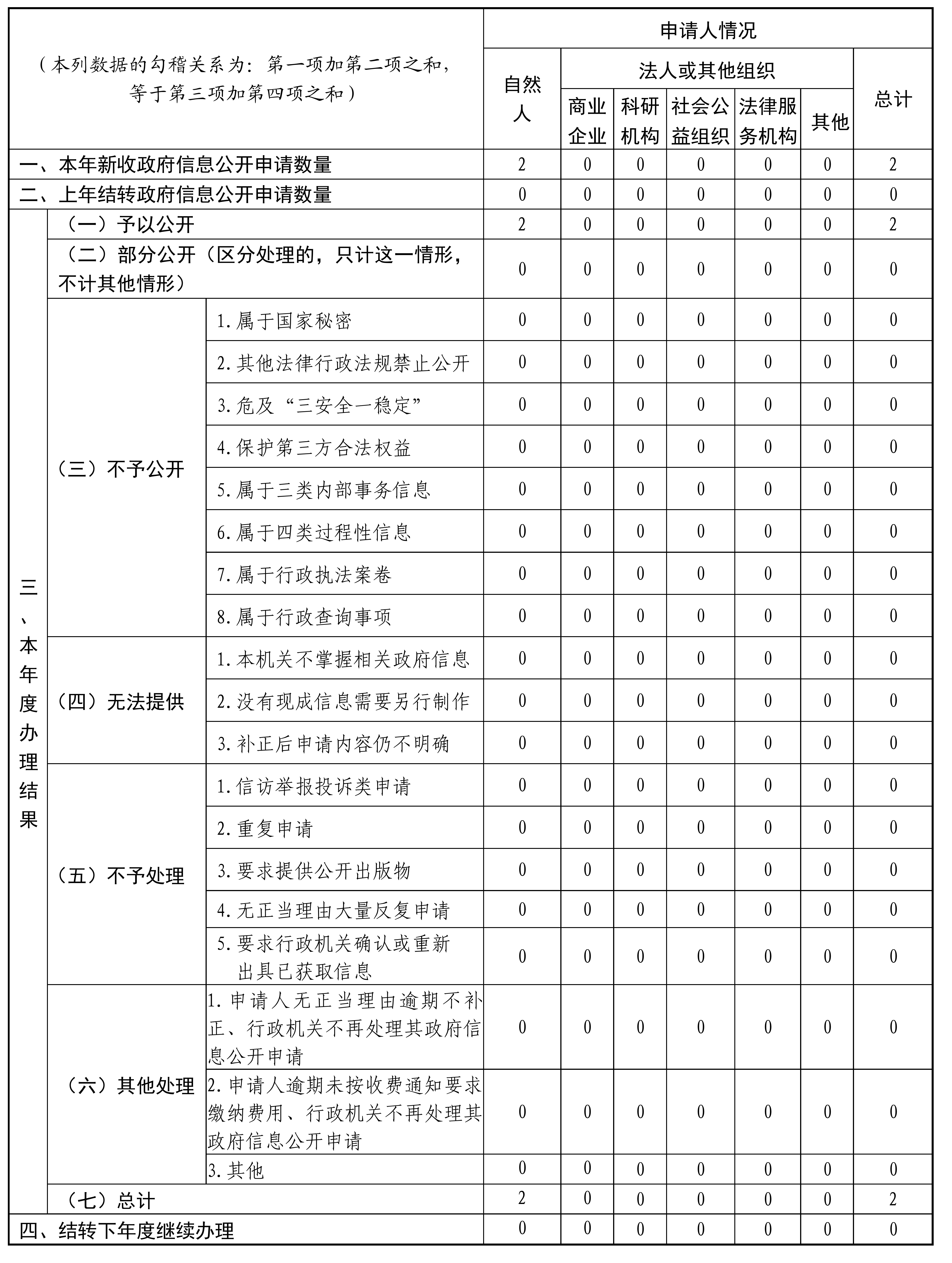 2023年共接到政府信息公开申请2件,均严格按照《政府信息公开条例》等有关规定进行办理和答复;政府信息公开申请数量与去年持平。本年度没有向政府信息公开申请人收取费用的情况。本年度未发生因政府信息公开被行政复议、提起行政诉讼情况。