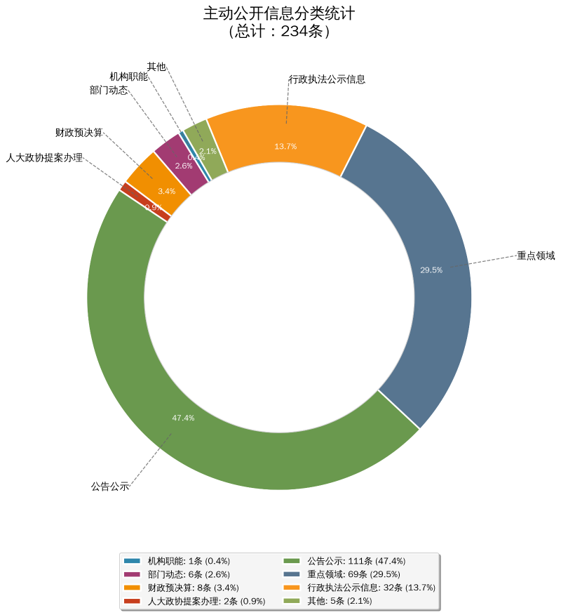 本年度政府信息公开平台共公开信息234条,其中机构职能1条;部门动态6条;财政预决算信息8条;人大政协提案办理2条;公告公示111条;重点领域信息69条;行政执法公示信息32条;其他信息5条。此外,以“政府开放日”“社保服务进万家”等线下活动为载体,精准宣传社保、就业等核心惠民政策,持续提升政策知晓率。