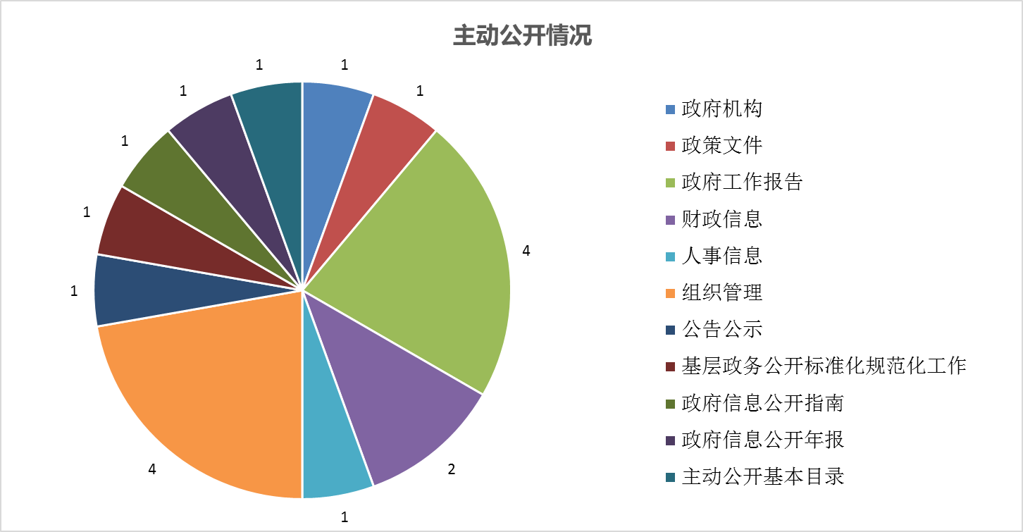 2023年度本单位主动公开政府信息共18条,其中政府机构类(领导信息)1条,政策文件类(部门文件)1条,政府工作报告(执行措施、进展情况)4条,财政信息类(预算决算)2条,人事信息类(人事任免)1条,组织管理类(政务公开组织领导、工作推进、工作培训)4条,公告公示类(通知公告)1条,基层政务公开标准化规范化工作(经验做法)1条,政府信息公开指南1条,政府信息公开年报1条,主动公开基本目录1条。