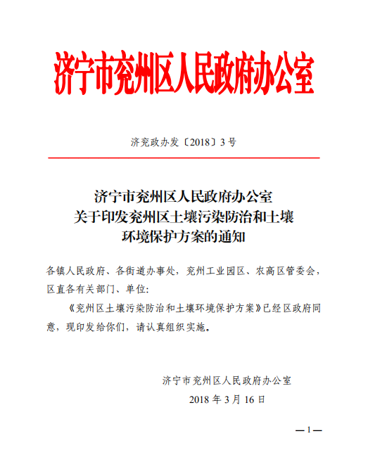 【PDF版下载】 济宁市兖州区人民政府办公室关于印发兖州区土壤污染防治和土壤环境保护方案的通知