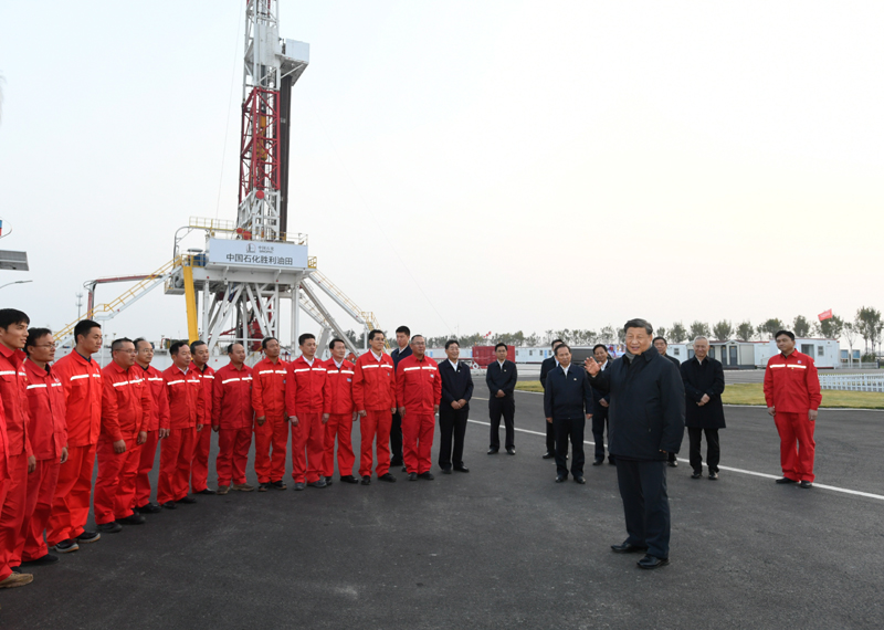 10月22日下午,中共中央总书记、国家主席、中央军委主席习近平在山东省济南市主持召开深入推动黄河流域生态保护和高质量发展座谈会并发表重要讲话。这是座谈会前,习近平21日下午在位于东营市莱州湾的胜利油田莱113区块考察时,同工人们亲切交流。新华社记者
