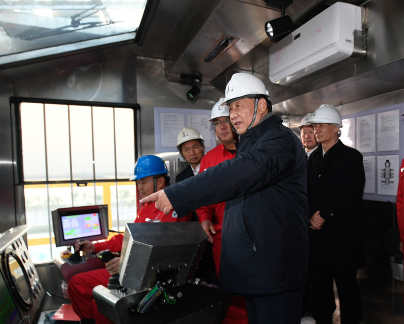 10月22日下午,中共中央总书记、国家主席、中央军委主席习近平在山东省济南市主持召开深入推动黄河流域生态保护和高质量发展座谈会并发表重要讲话。这是座谈会前,习近平21日下午在位于东营市莱州湾的胜利油田莱113区块考察时,登上二层钻井平台,察看钻井自动化设备。新华社记者