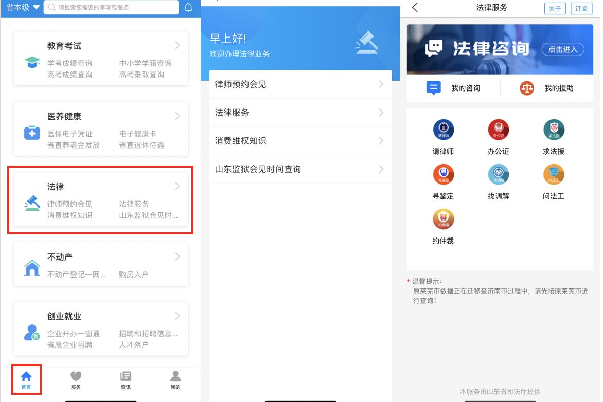 为全面提升法律服务数字化、智能化水平,“爱山东”APP推出法律服务专区,实现法律服务"网上办、指尖办"。
