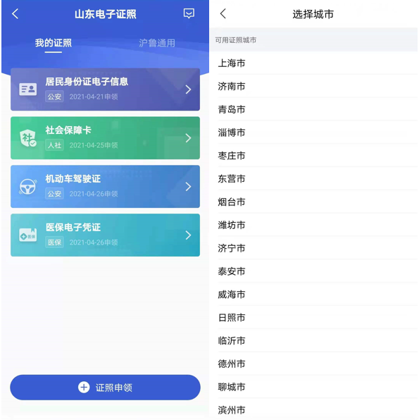二是功能丰富,支持山东16地市电子证照的申领与亮证使用。依托各市一体化政务服务平台、电子证照系统,“爱山东”实现16市电子证照数据调用共享与业务协同,进一步方便各市企业群众办事。此外,电子证照信息更加丰富,由原来的仅显示证照名称新增加了归属部门、申领时间等信息。