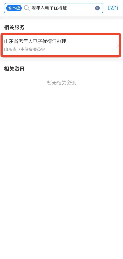 2. 在“爱山东”APP首页搜索“老年人电子优待证”,点击进入(如图2)。