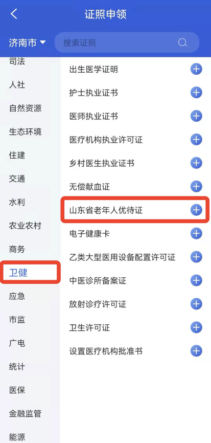 4. 办理成功后,在“我的-我的证照”处,选择卫健分类下的“山东省老年人优待证”,点击“+”申领(如图4)。