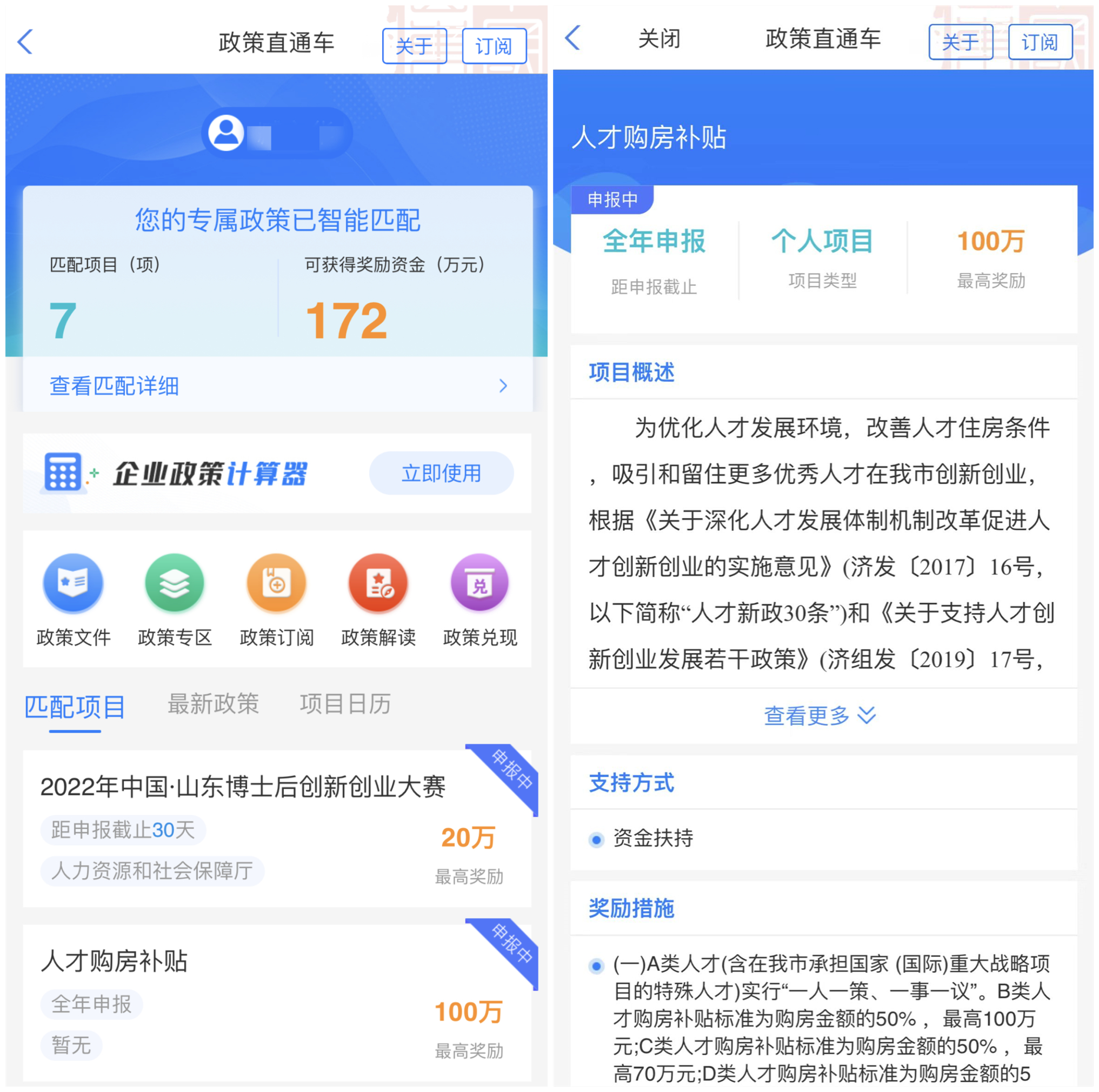 此外,打开“爱山东”,首页上方搜索框输入“政策直通车”,还可查看你的专属匹配项目、获得奖励资金,以及其他项目的具体介绍。