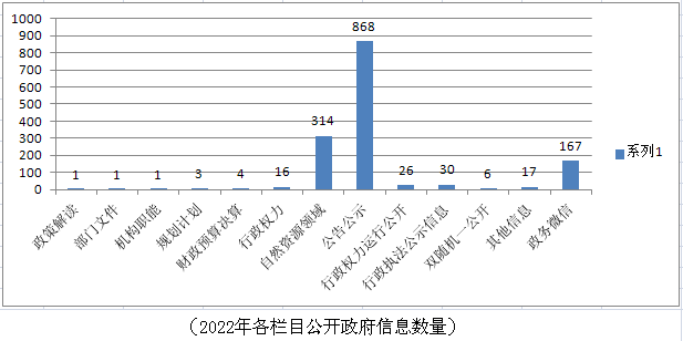 2022年,我局通过兖州区人民政府门户网站主动公开政府信息1287条,其中政策解读信息1条、部门文件信息1条、机构职能信息1条、规划计划信息3条、财政预算决算信息4条、行政权力信息16条、自然资源领域信息314条、公告公示信息868条、行政权力运行公开信息26条、行政执法公示信息30条、“双随机一公开”信息6条、其他信息17条;通过政务微信公开政府信息167条。