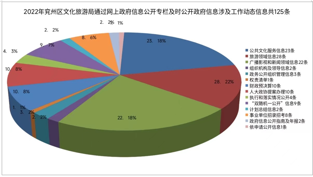 2022年,我局通过网上政府信息公开专栏及时公开政府信息共125条,其中公共文化服务信息23条、旅游领域信息28条、广播影视和新闻领域信息22条、组织机构及领导信息2条、政务公开组织管理信息3条、权责清单1条、财政预决算10条、人大政协提案办理10件、执行和落实情况公开4条、“双随机一公开”信息9条、计划总结信息2条、事业单位招录招考8条、政府信息公开指南及年报2条、依申请公开信息1条。