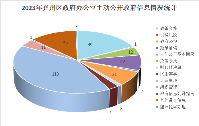 2023年,兖州区政府办公室严格按照《2023年济宁市政务公开重点工作任务分解表》,按时出台《2023年兖州区政务公开重点工作任务分解表》,紧紧围绕主动公开、政策解读、公众参与、依申请公开等落实责任分工,明确工作重点,全面推进全区政务公开工作。