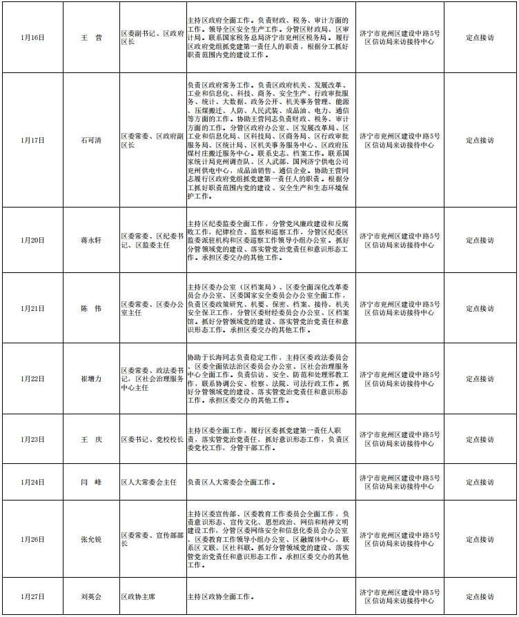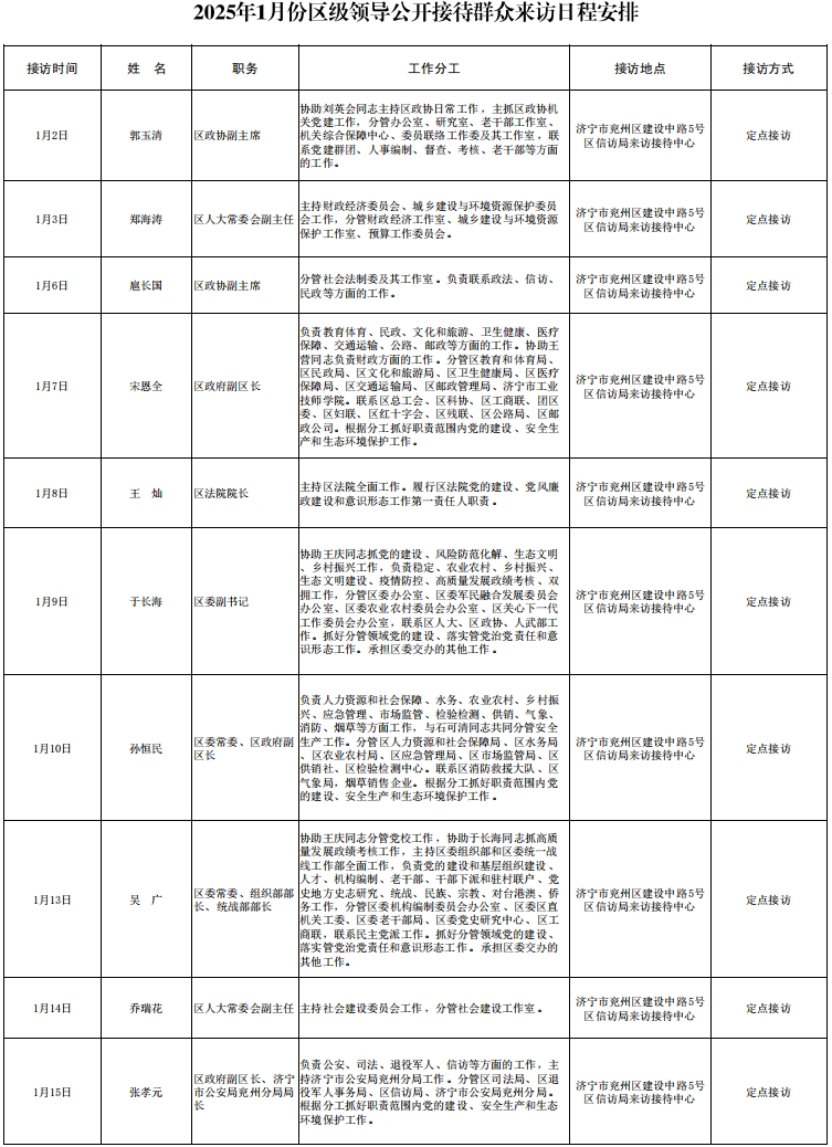 2025年1月份区级领导公开接待群众来访日程安排