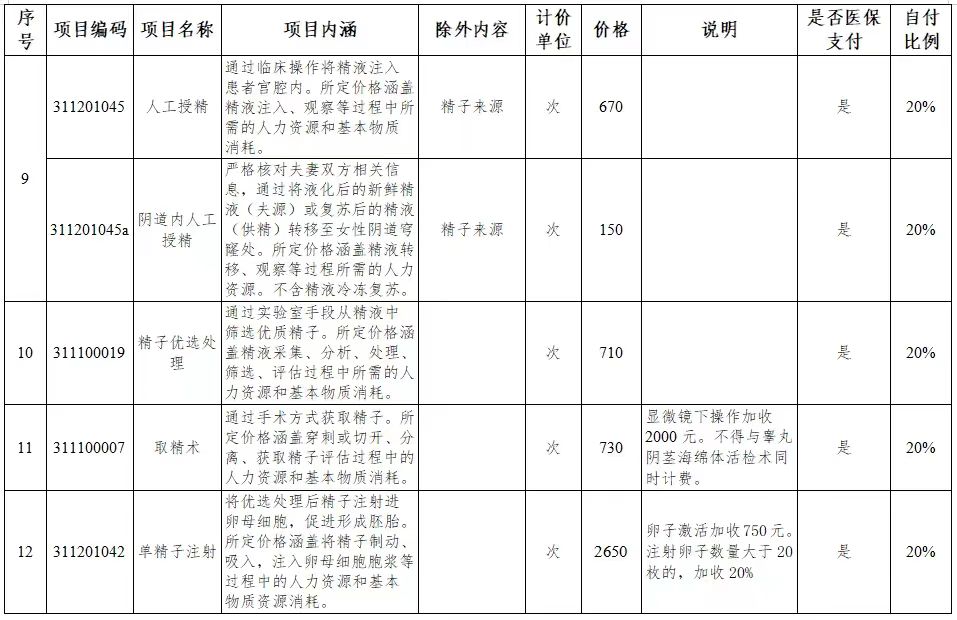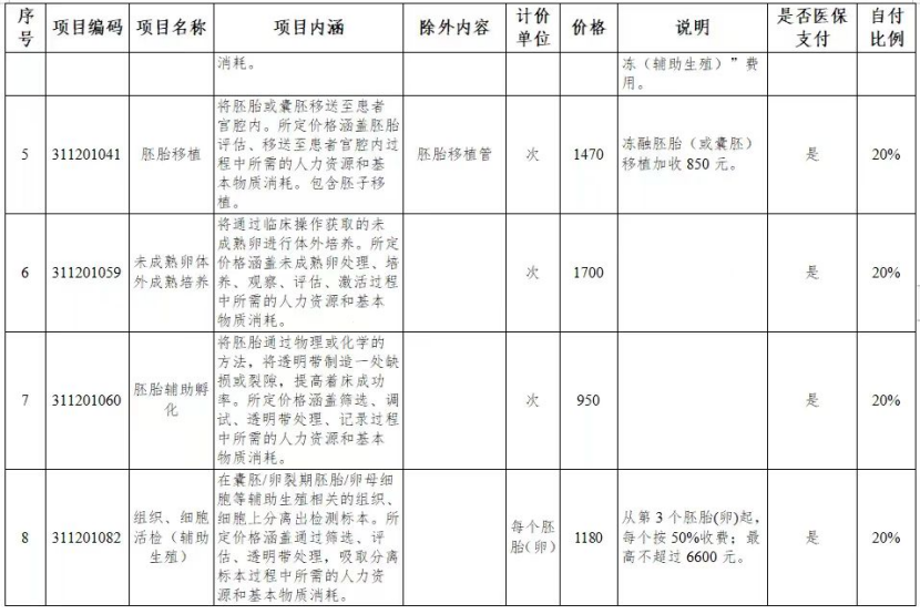 纳入基本医保基金支付范围的医疗服务项目详见下表(11个),医保个人先行自付比例20%,其他与治疗性辅助生殖相关的医疗服务项目及药品等个人先行自付比例按我市基本医保政策执行。