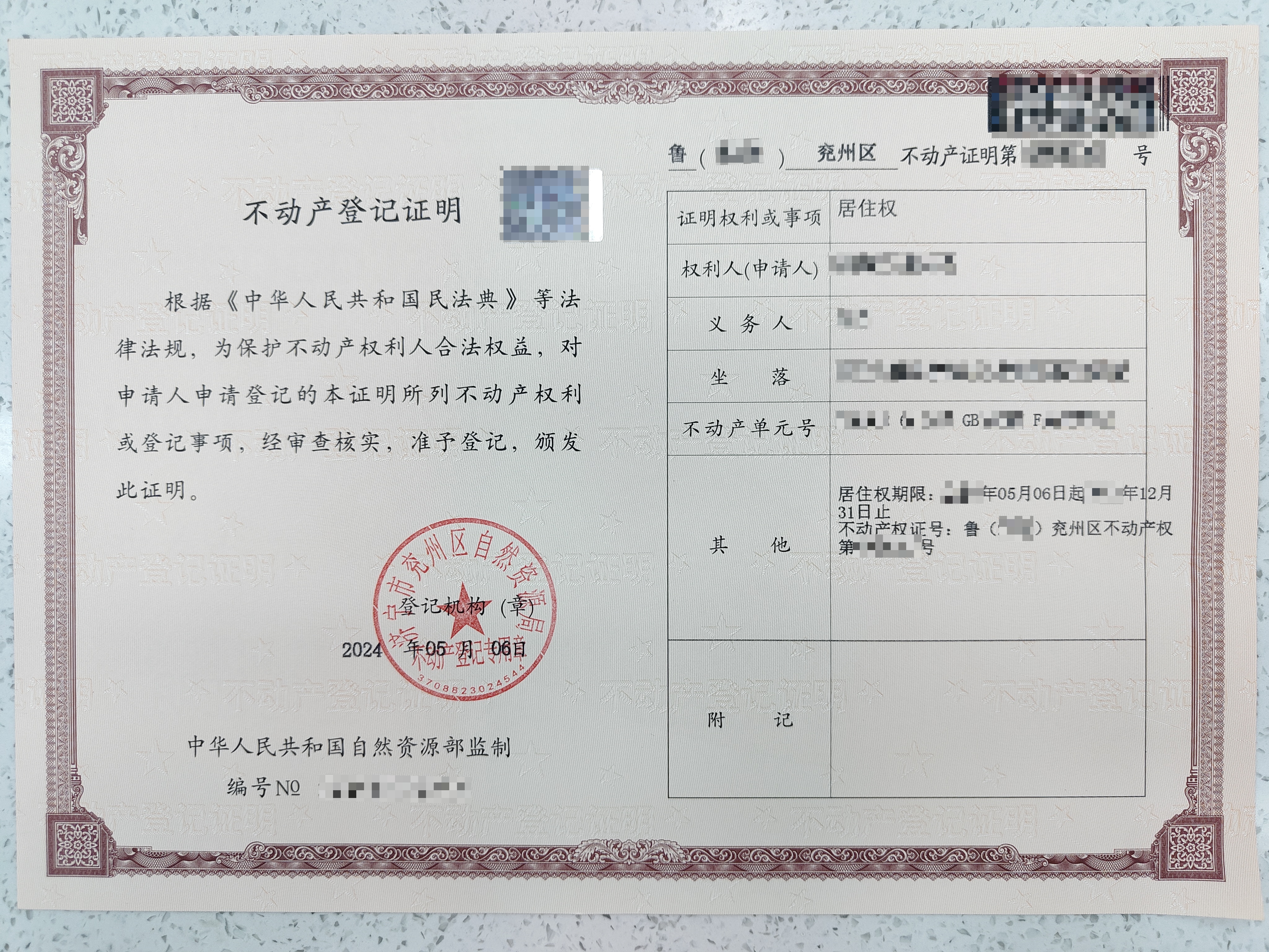 5月6日,济宁市兖州区不动产登记中心完成首笔居住权登记业务,为市民闫先生和蔡女士颁发了兖州区第一张居住权登记证明。