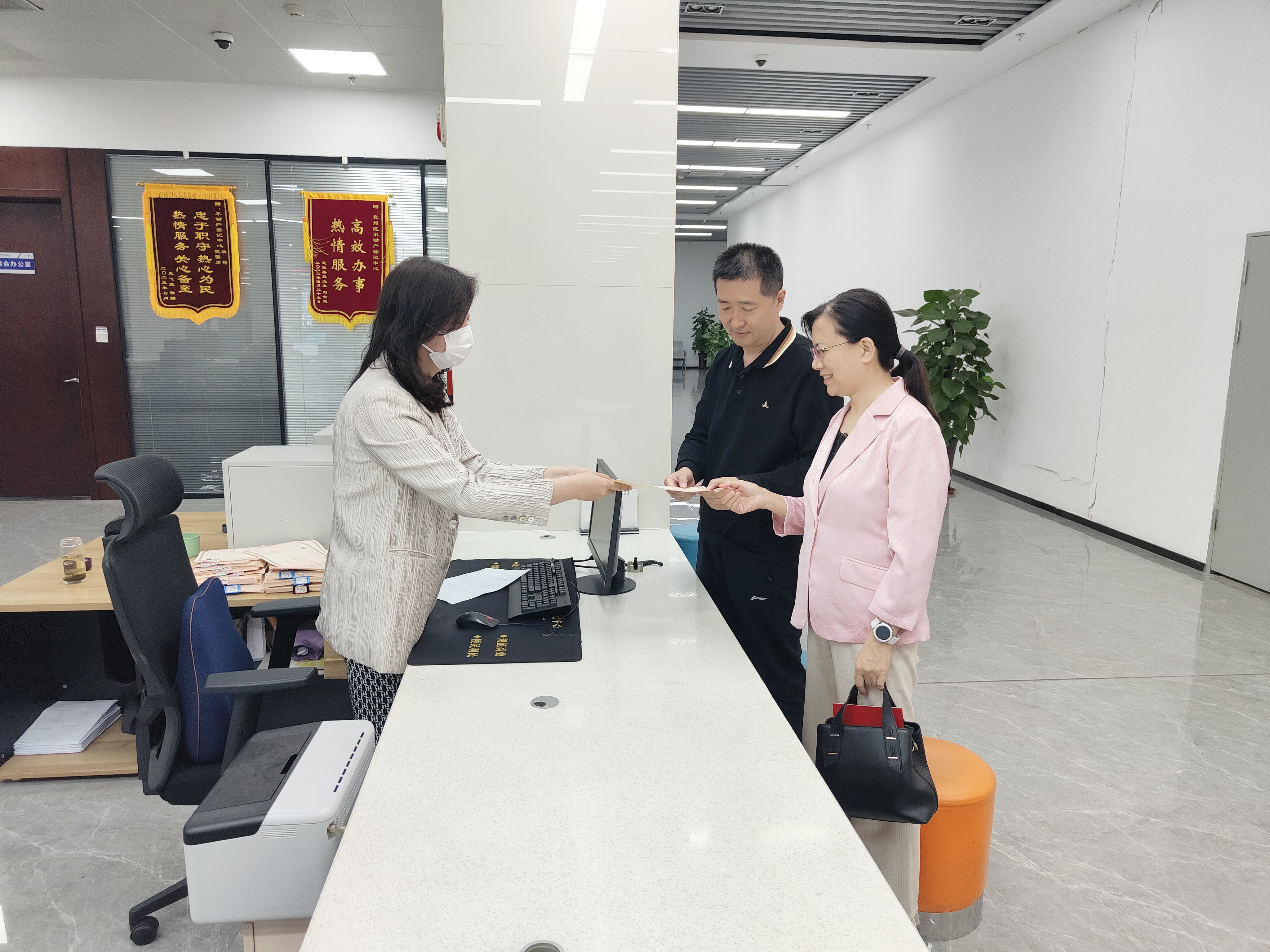 经了解,闫先生夫妇之前为儿子购买了锦绣家园小区的房子并办理了不动产权证书,为确保夫妇二人居住权利,双方共同向区不动产登记中心申请办理居住权登记。了解相关情况后,工作人员热心细致的为其受理了居住权业务,仅用时半小时,闫先生夫妇就拿到了居住权登记证明,二人的脸上露出了满意的笑容。