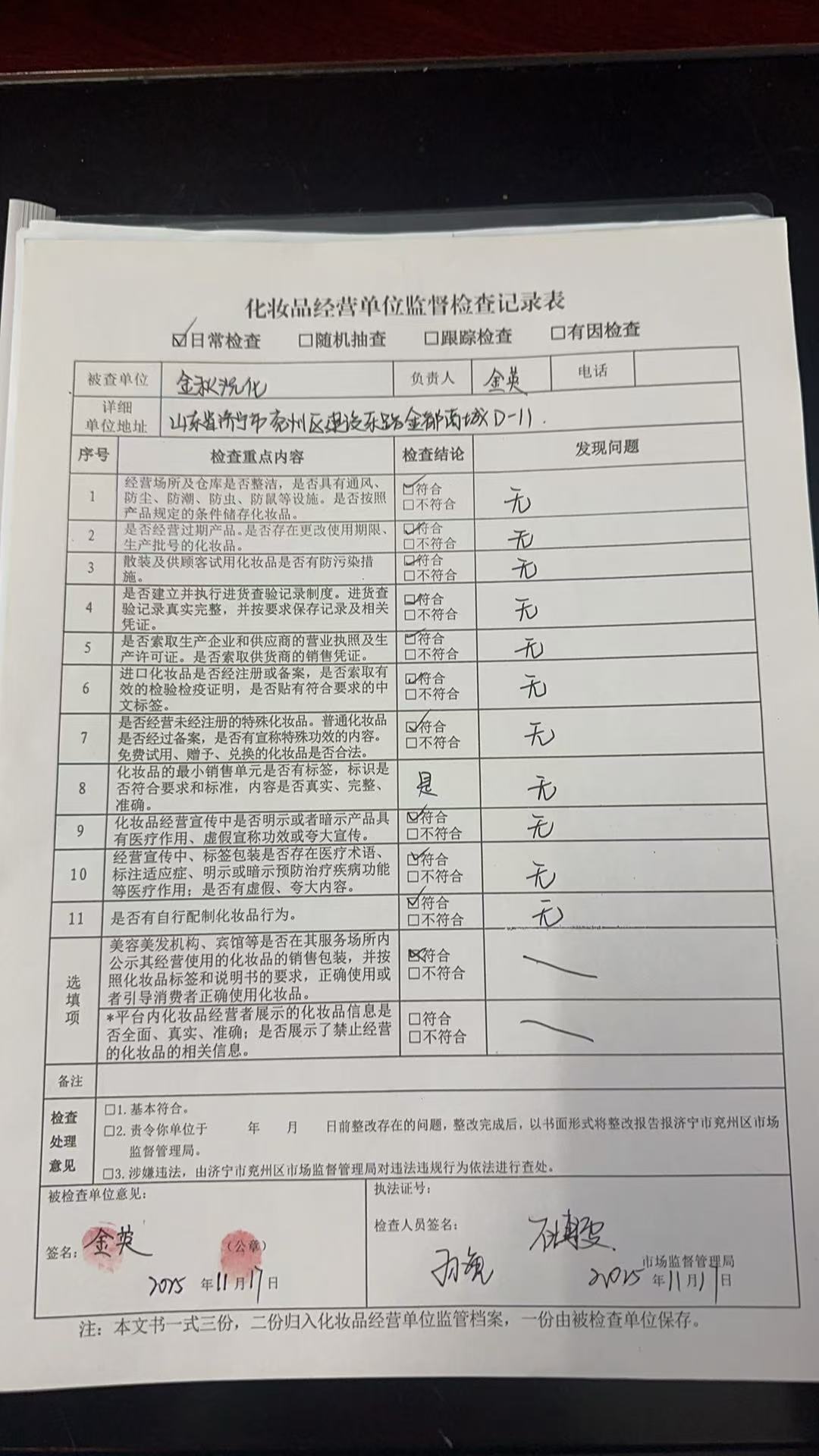 【化妆品经营监督检查结果】金秋洗化检查记录表